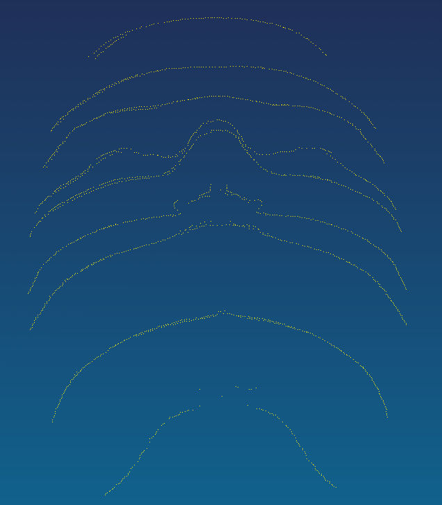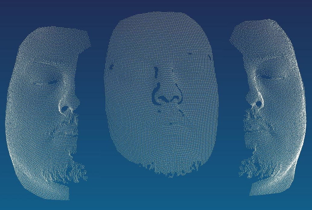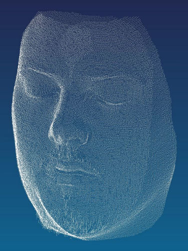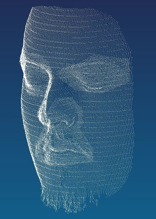 The problem with this method is that even the slightest change in facial expression creates double surfaces where your cheeks are puffed out more or you neck is more stretched out. This is best seen when the cloud is cut up into scanlines.